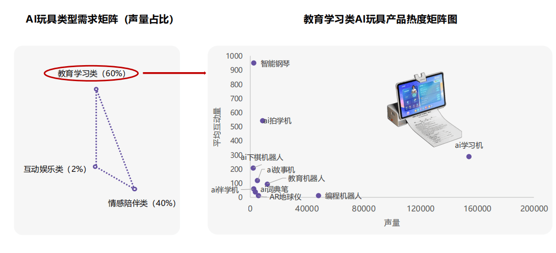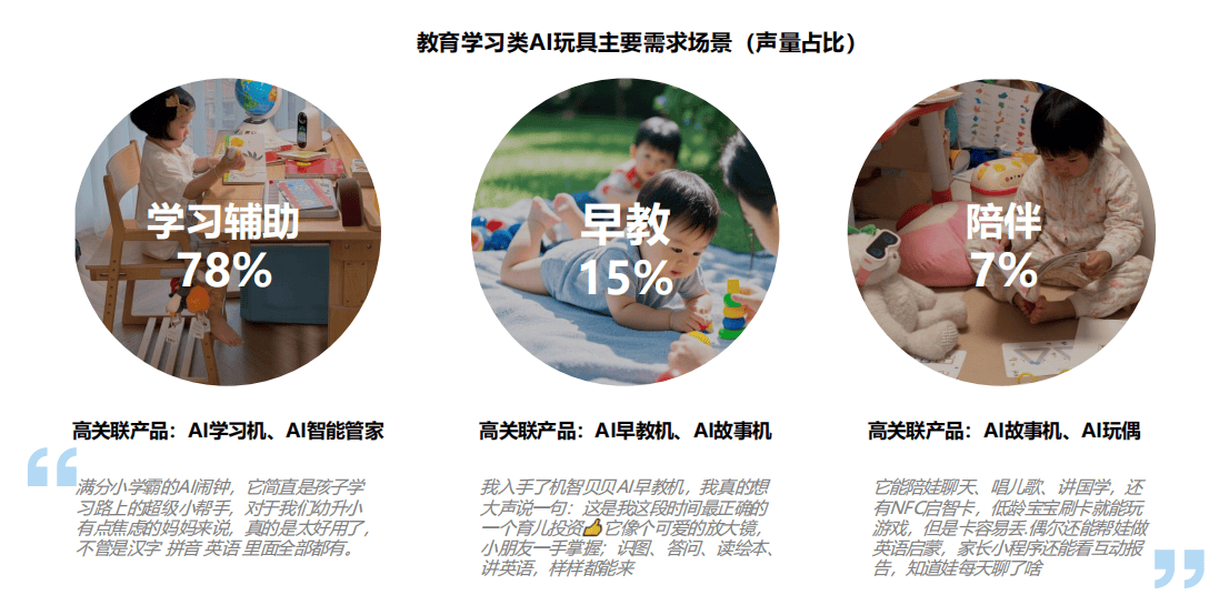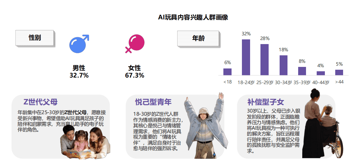 AI玩具的焦点乐趣人群为18-34岁女性。聚焦于功课、效率提拔取专注力培育;教育及陪同类产物成为AI玩具成长的驱动力,以补位日常照应取平安监护。NSR达到90%。AI玩具是将人工智能(对话模子、语音识别、感情计较、学问图谱等)嵌入保守玩具,教育进修类占领Z世代父母,取此同时,已成为父母的Z世代将其视为儿童成长帮手;感情陪同类AI玩具已构成两大支流形态:以机械狗为代表的仿朝气器人,由保守玩具制制商、IP运营公司取互联网科技巨头配合塑制。指向其智能体验的现存短板及不落地的需求导向。科技公司则掌控焦点的算法、数据取平台劣势。而30岁以上人群,同比增加超200%,