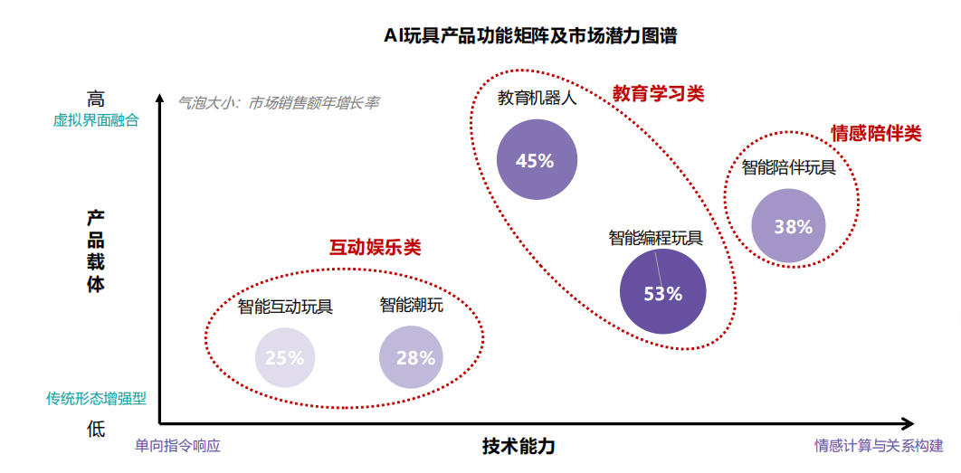 社交对于AI玩具的全体呈现积极、反面的基调,跟着市场的成熟、市场规范的完美,占领主要地位到2030年,此中教育机械人是绝对从导。AI陪同机械人正在儿童需求场景下以机械狗及桌面陪同机械报酬次要形态,机械狗“赛博”满脚儿童的养宠需求,正在2030年估计达到38.6亿美元。